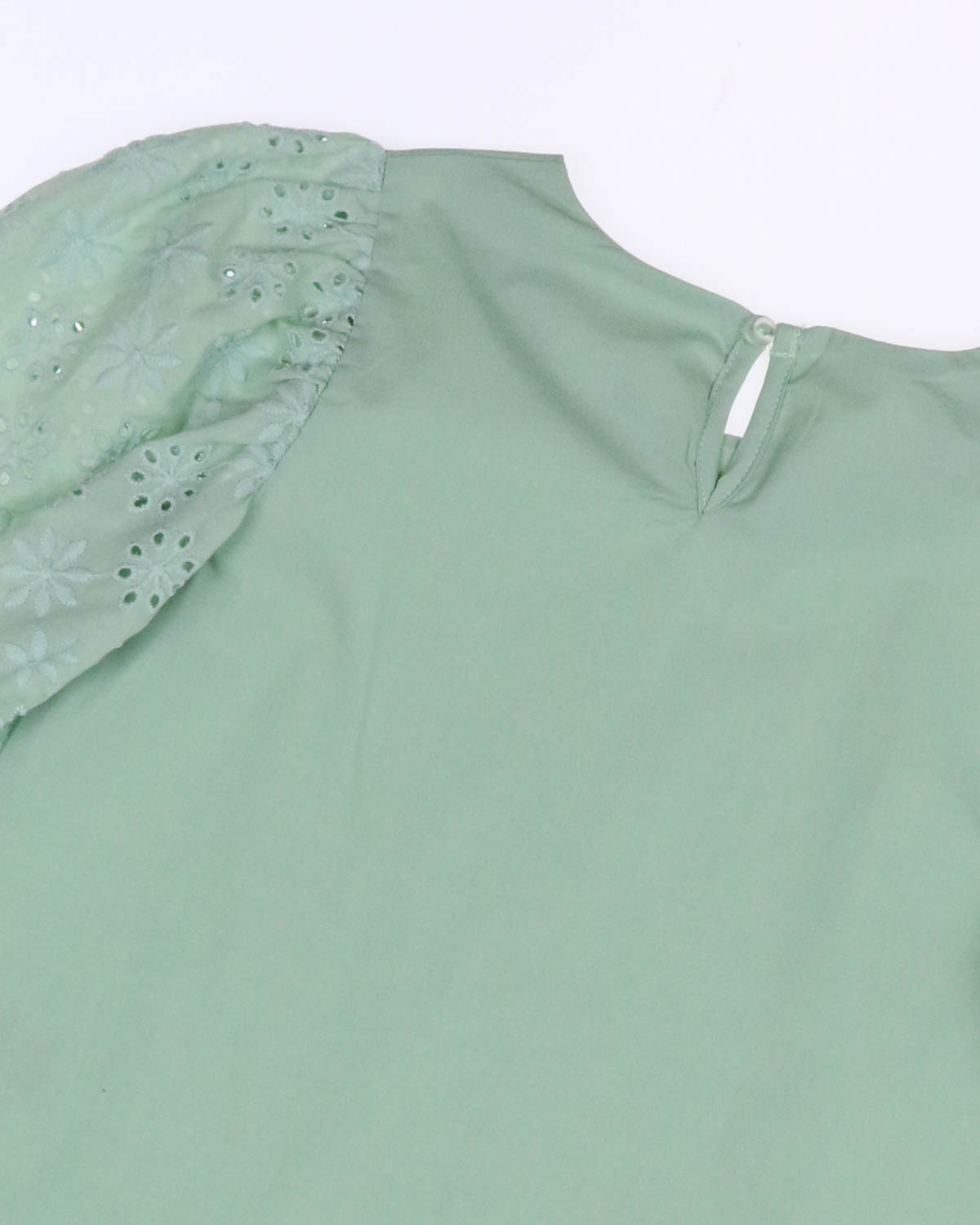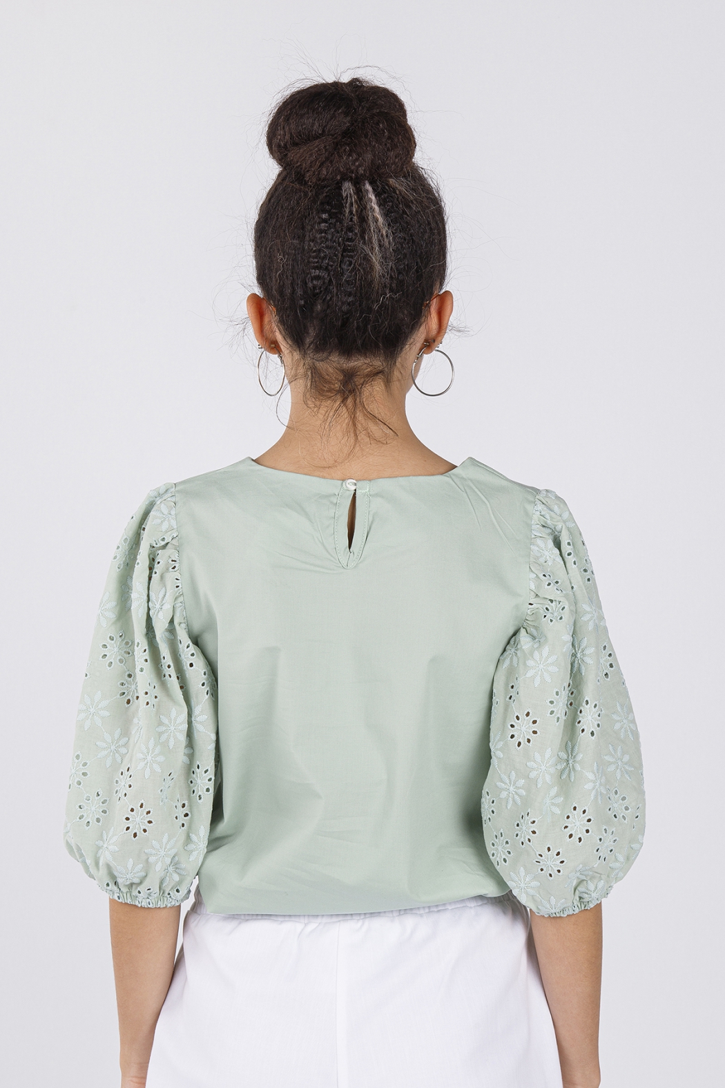 Стильная блузка прямого кроя, сшита из шелковистого хлопка с добавлением эластана. Блузку украшают рукава из красивого, нарядного шитья. Для комфортного надевания блузка застегивается на пуговицу.