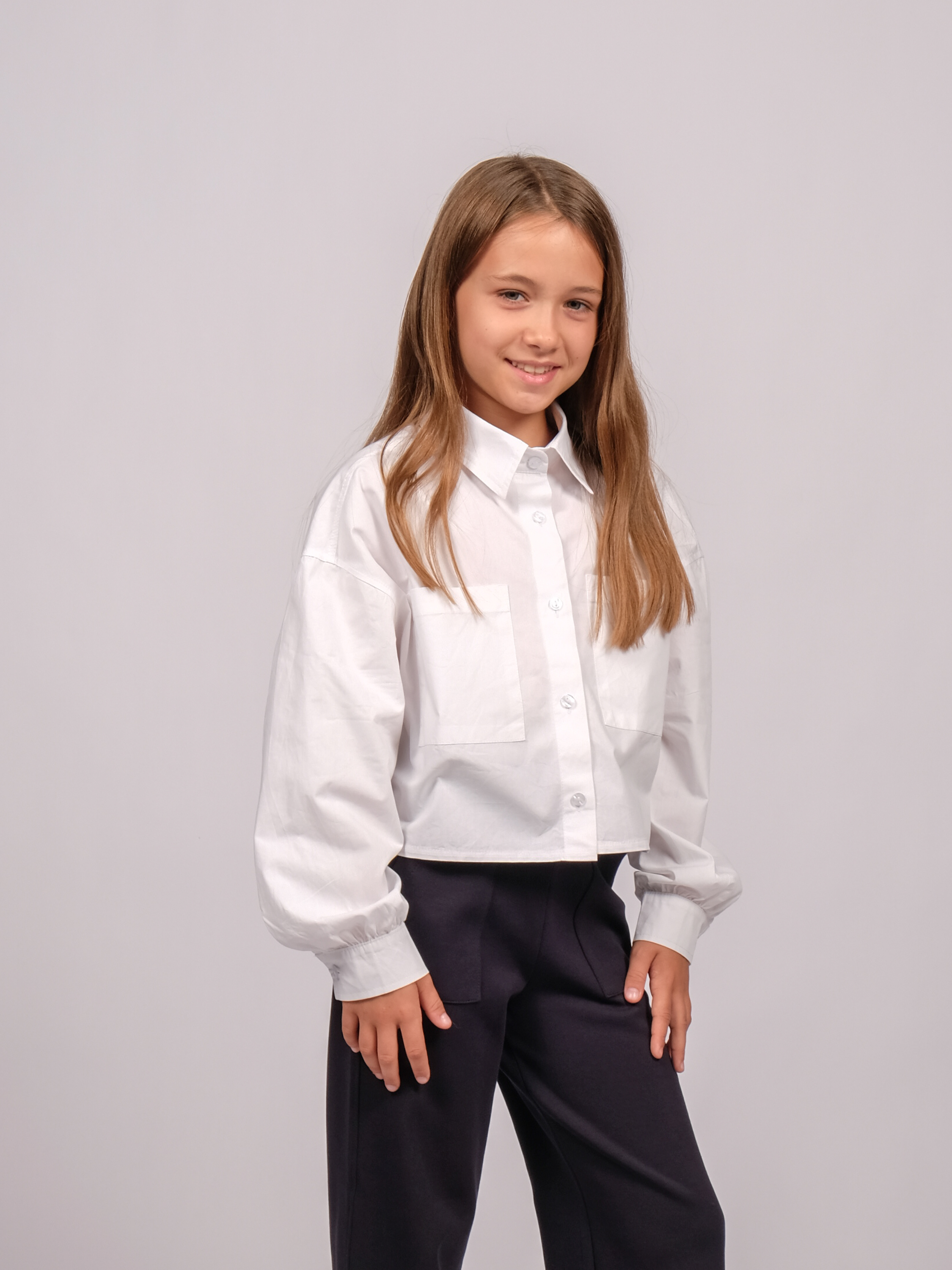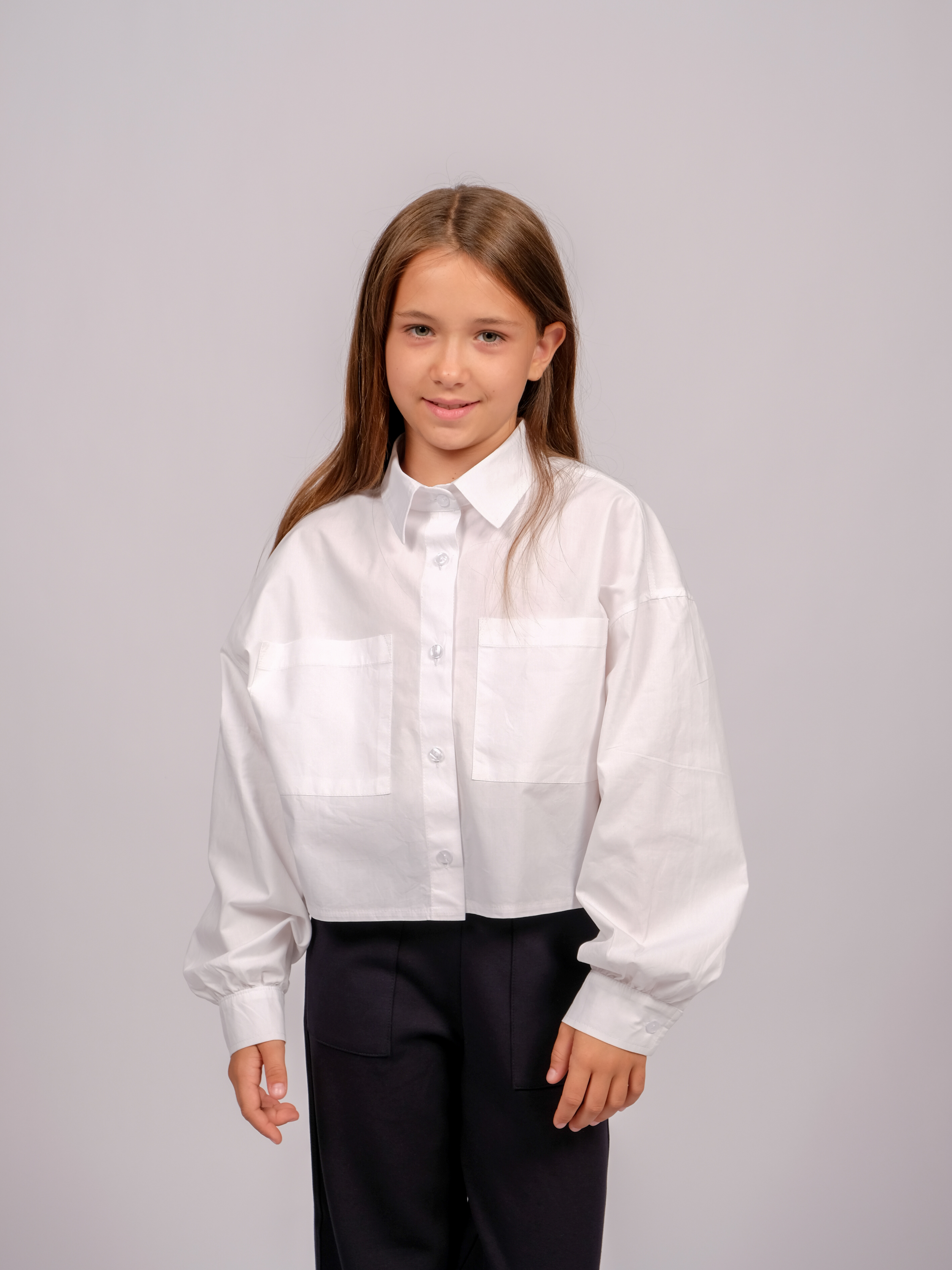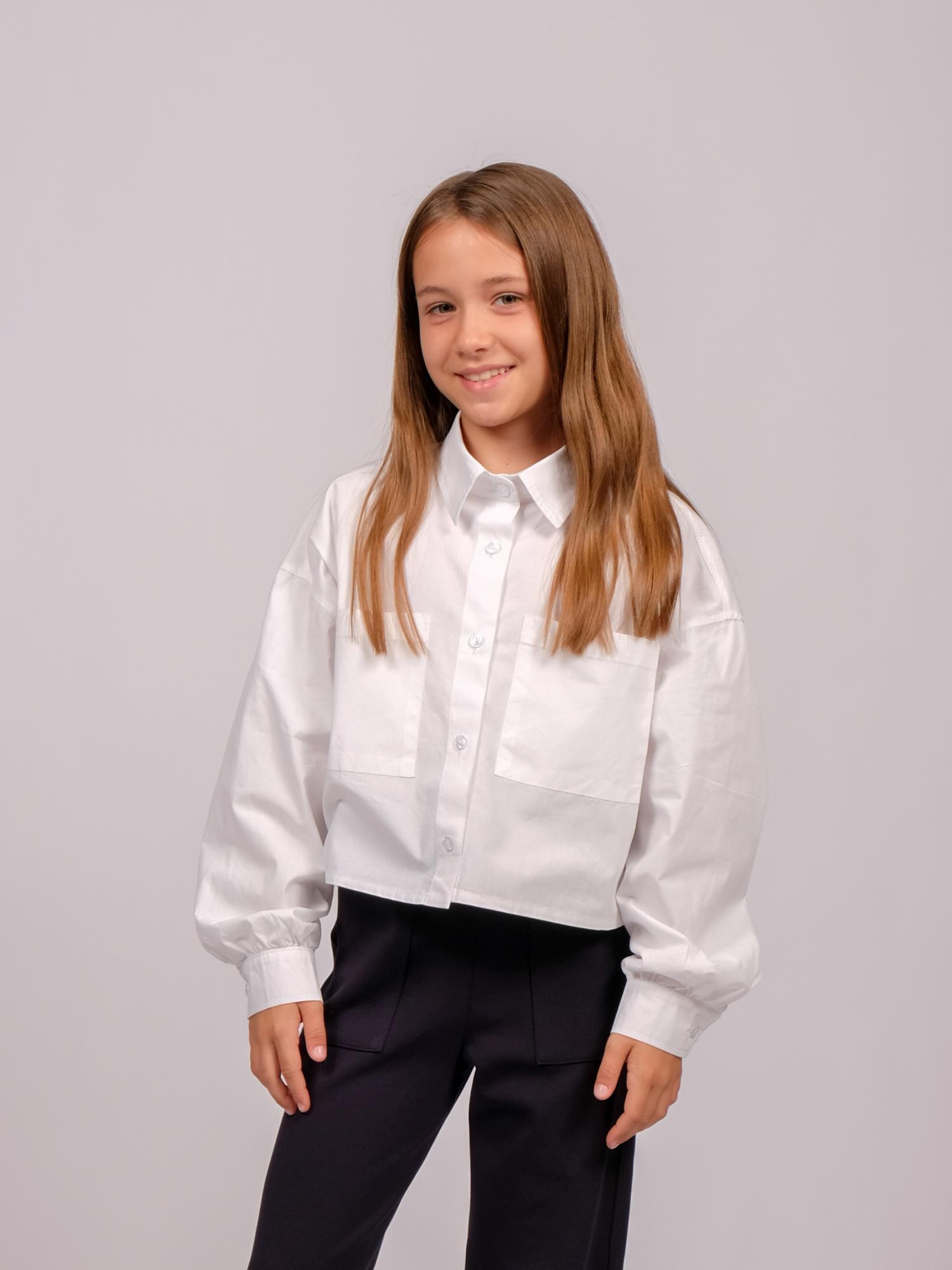 Укороченная рубашка для девочки оптом. Модель объемная, прямого кроя, застегивается на пуговицы, рукава с манжетами, на груди два накладных кармана.