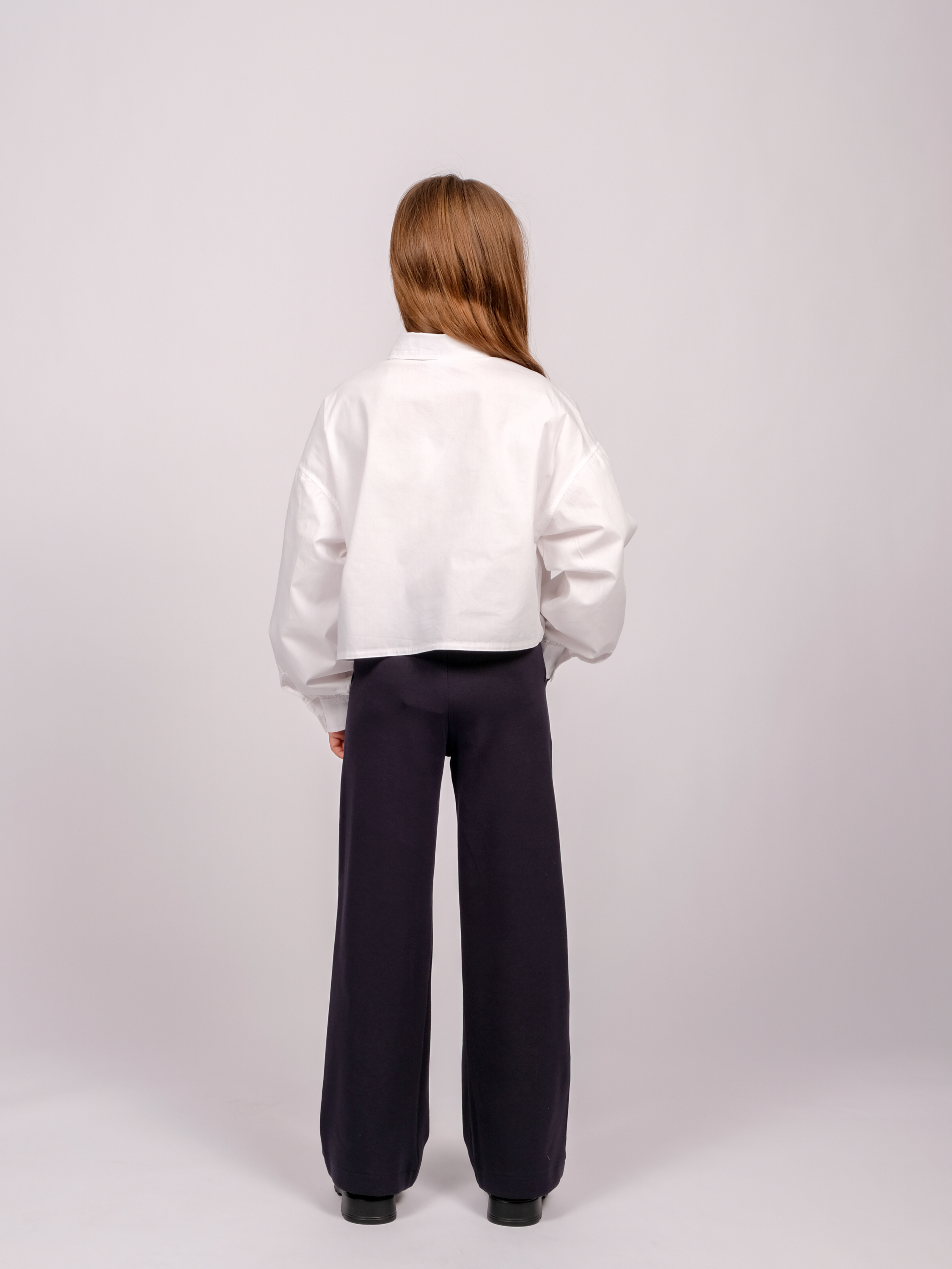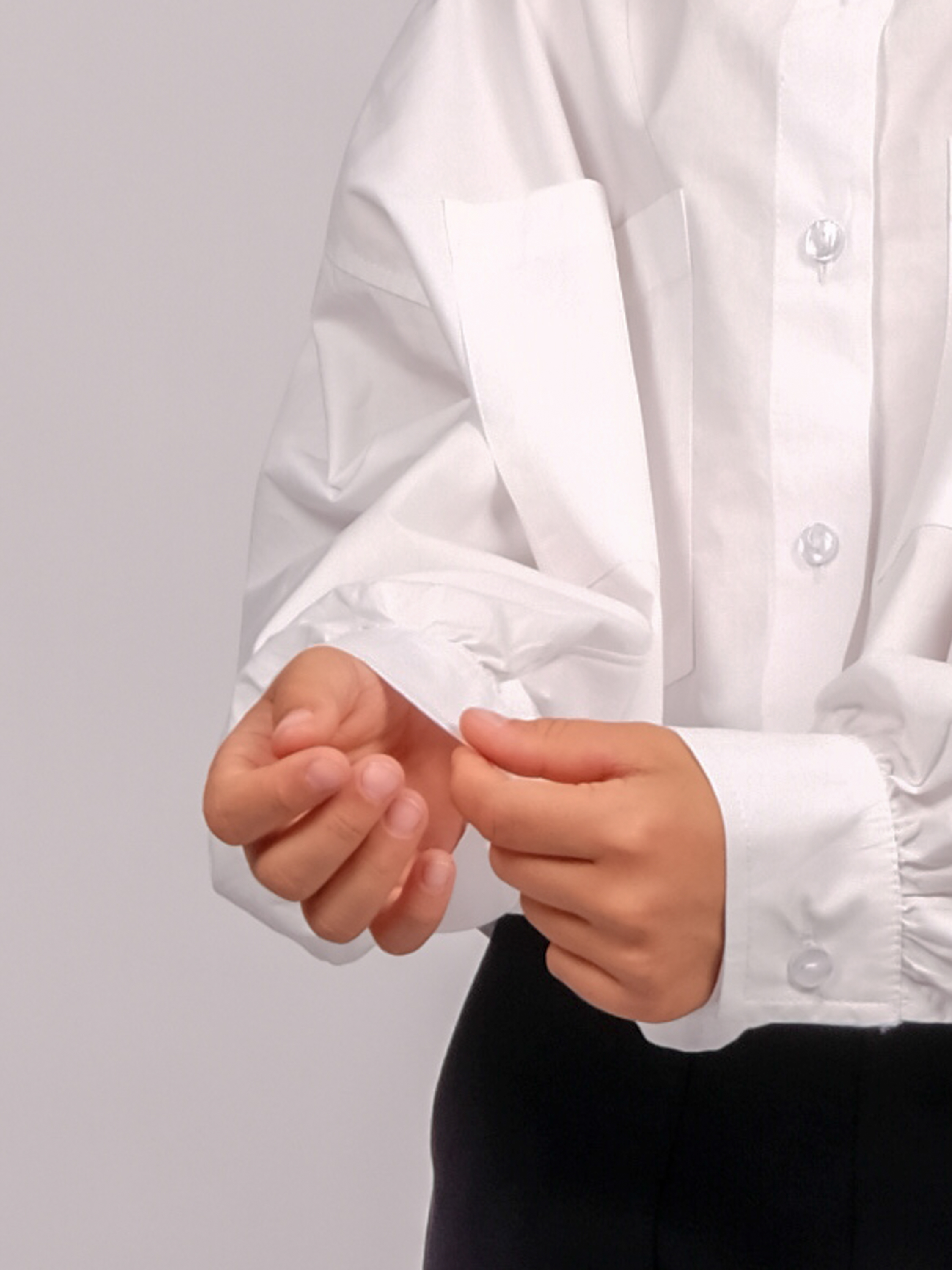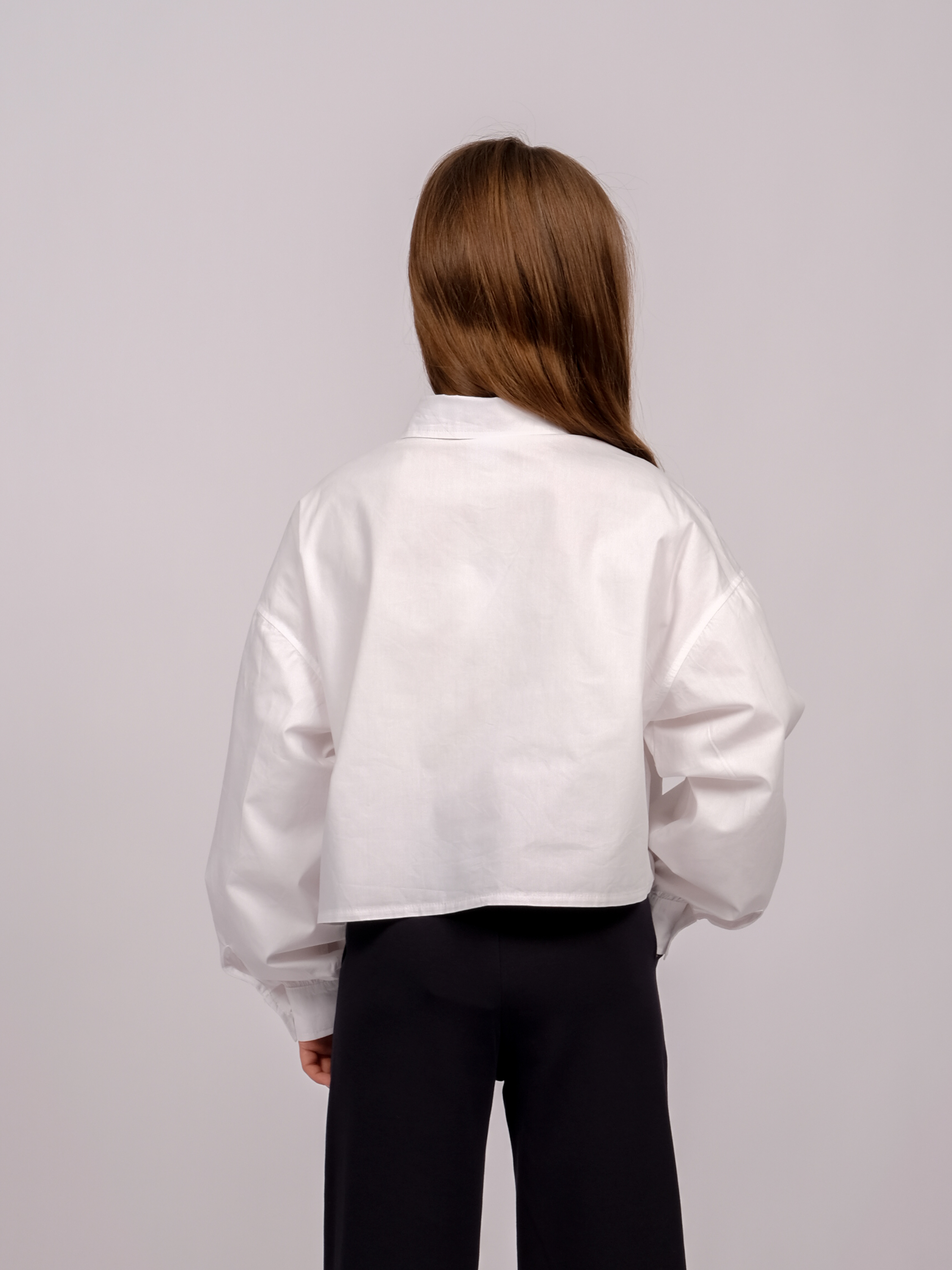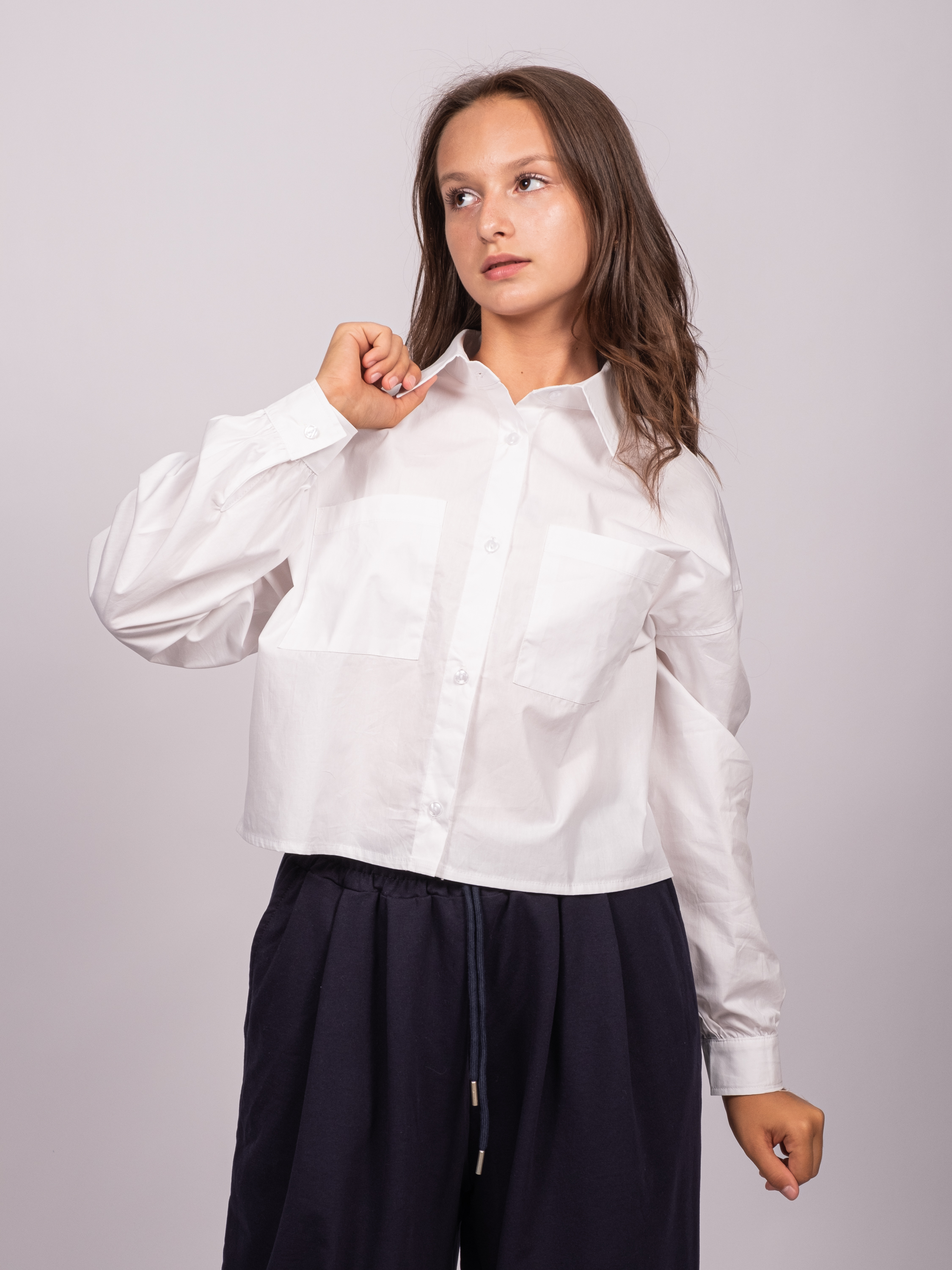 Укороченная рубашка для девочки оптом. Модель объемная, прямого кроя, застегивается на пуговицы, рукава с манжетами, на груди два накладных кармана.
