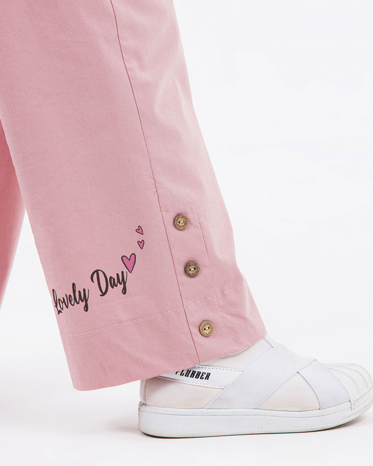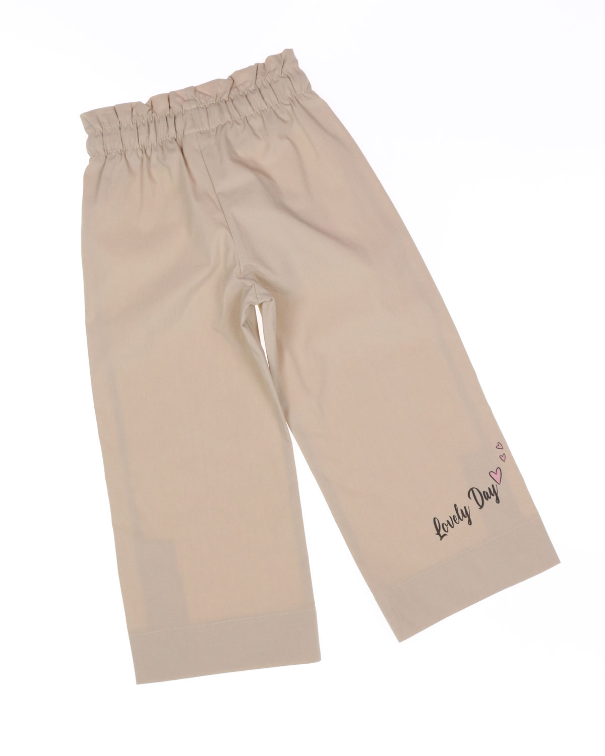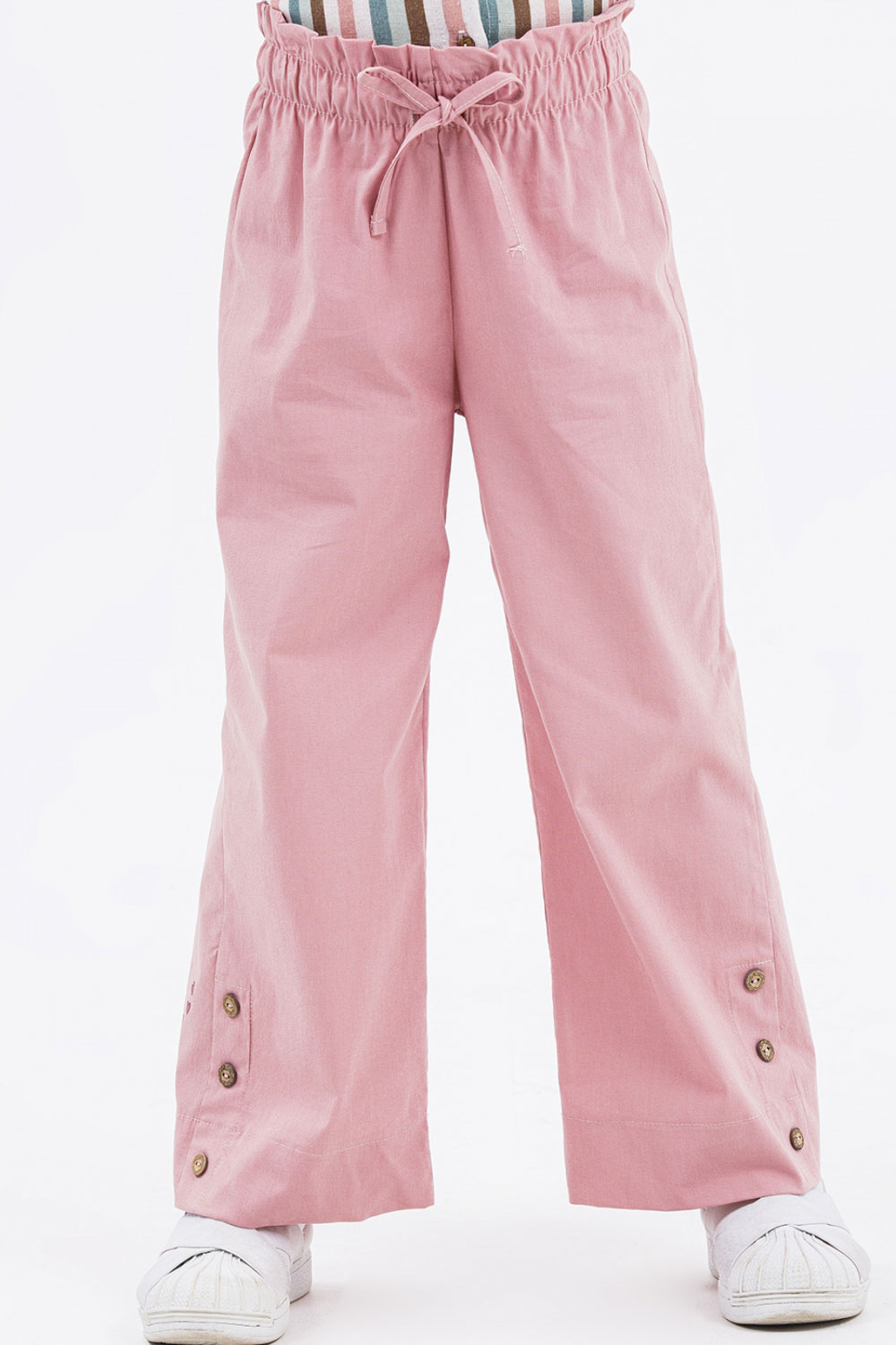 Летние брюки Dmb для девочки оптом. Трендовая модель сезона. Брюки декорированы пуговицами и принтом. Пояс на резинке с функциональным шнурком позволяет регулировать объем на талии.