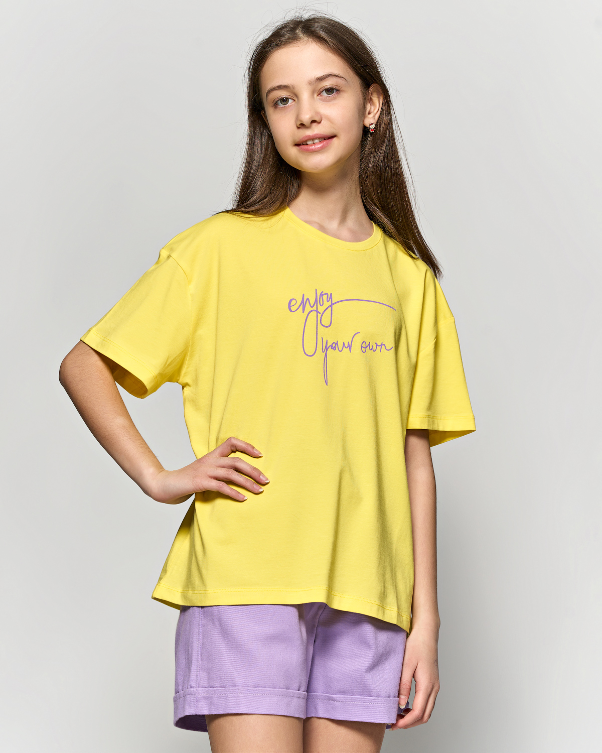 Футболка Cegisa для девочки оптом, выполнена из высококачественного трикотажа. Фасон футболки прямой, укороченный,  на груди  стильный принт.