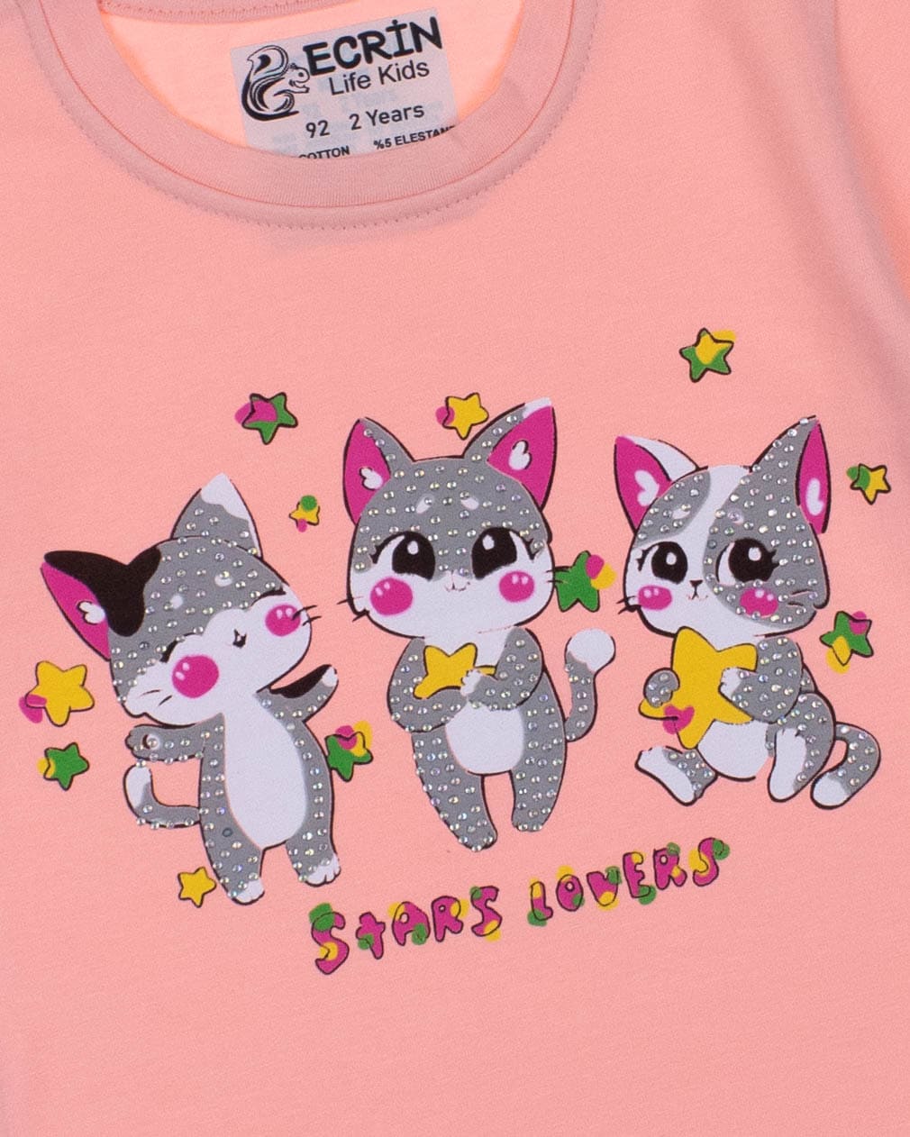 Футболка ECRIN для девочки оптом, производства Турция. Модель приталенного силуэта с короткими рукавами, милый принт украшен стразами.