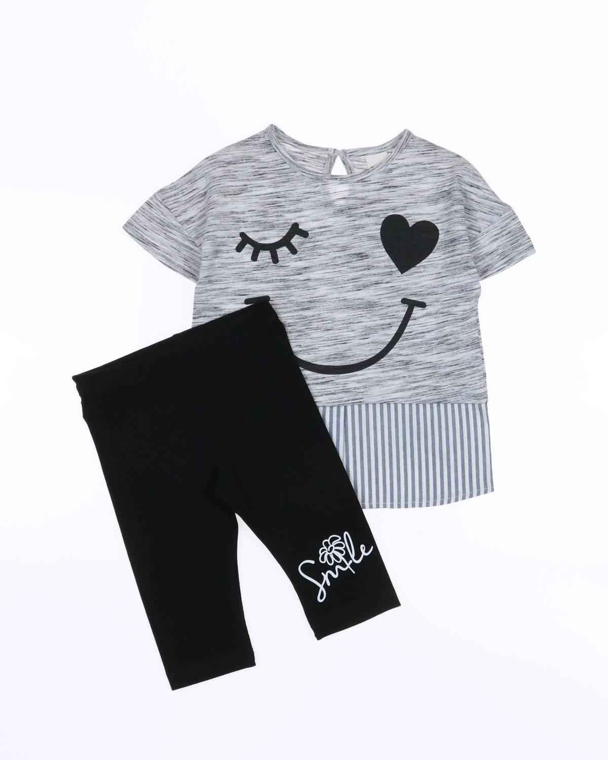 Костюм для девочки с бриджами. Футболка со спущенной линией плеча, низ футболки оформлен баской из хлопка.