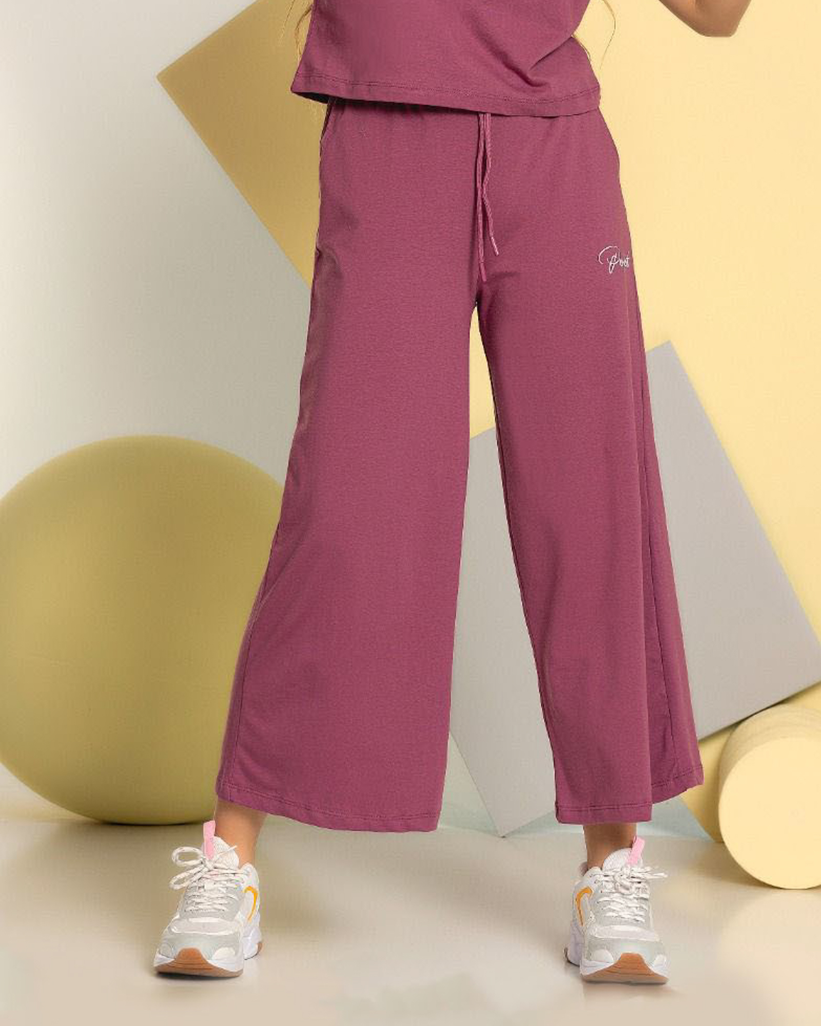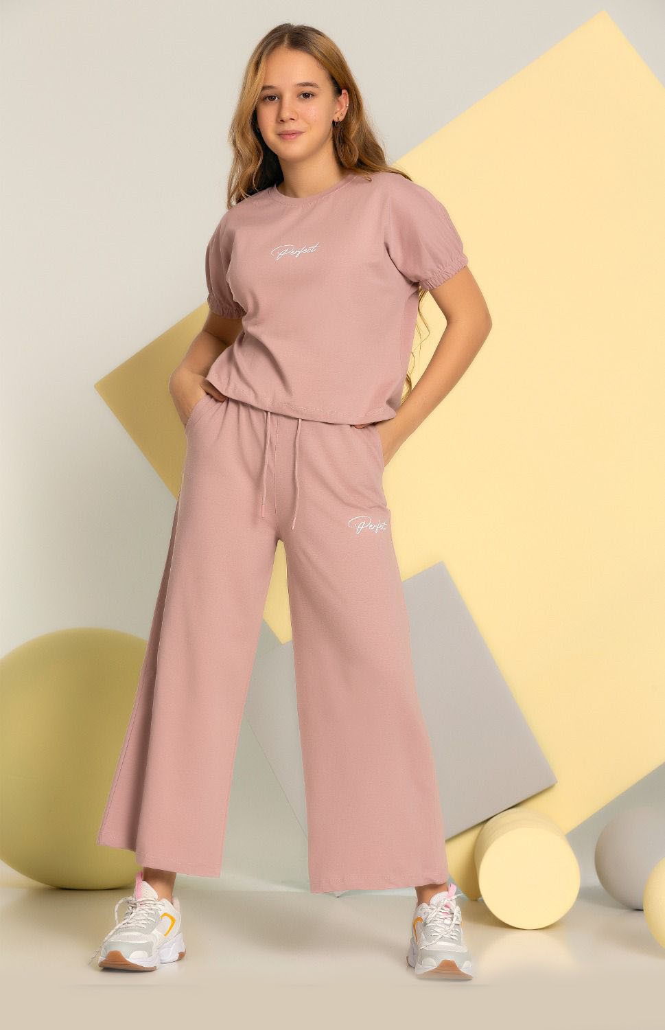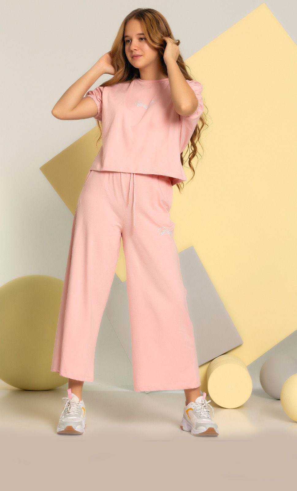 Комплект Smile оптом состоит из свободных брюк на широкой резинке и укороченной футболки. Рукава присборенны эластичной резинкой.