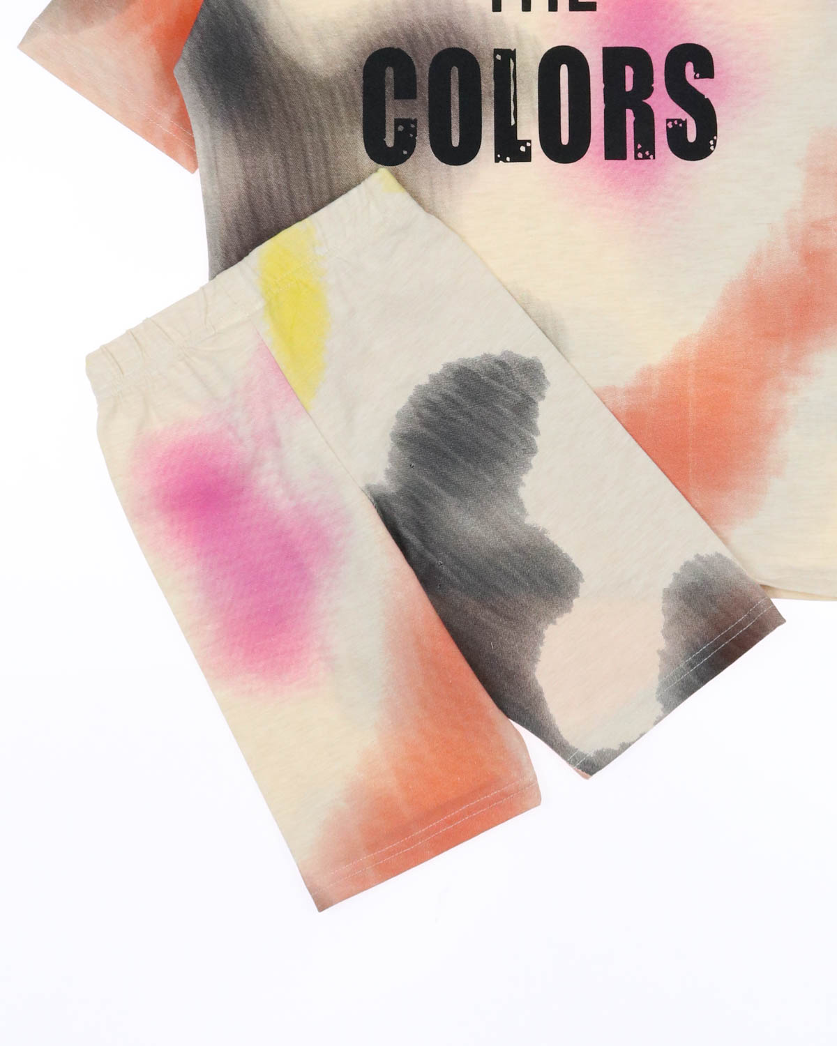 Модель включает в себя футболку свободного силуэта со спущенным плечом и велосипедки.