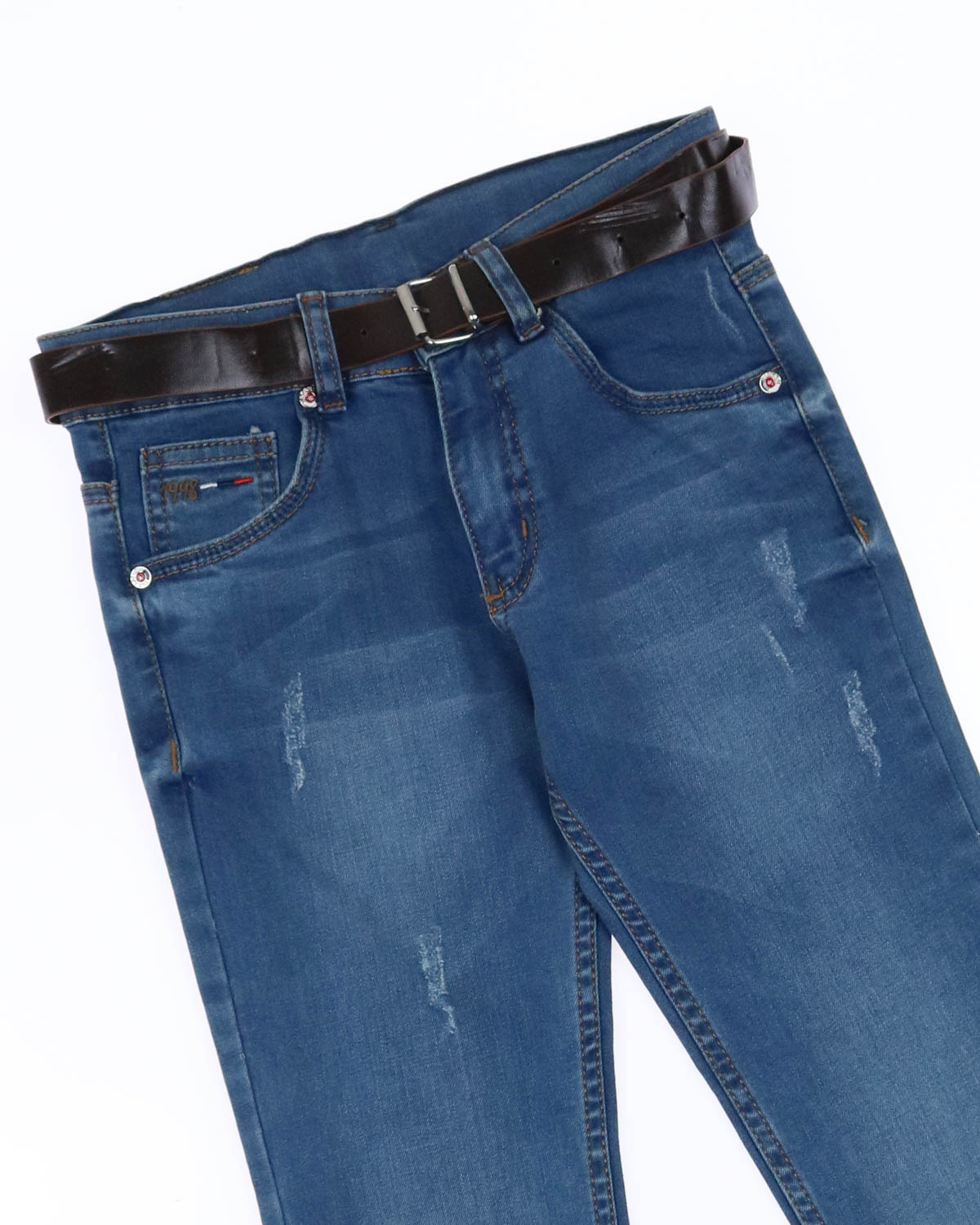 Классические джинсы синего цвета для мальчиков с добавлением эластана в классическом крое. Посадка талии средняя. Внутри на поясе есть регулятор талии.