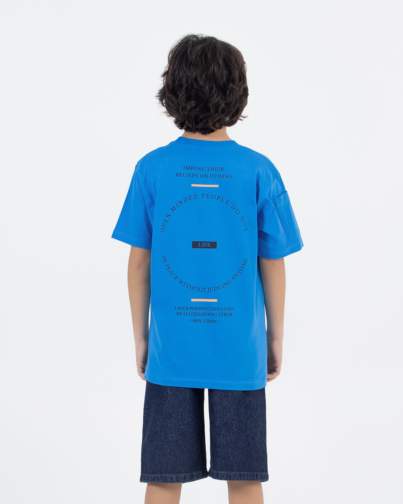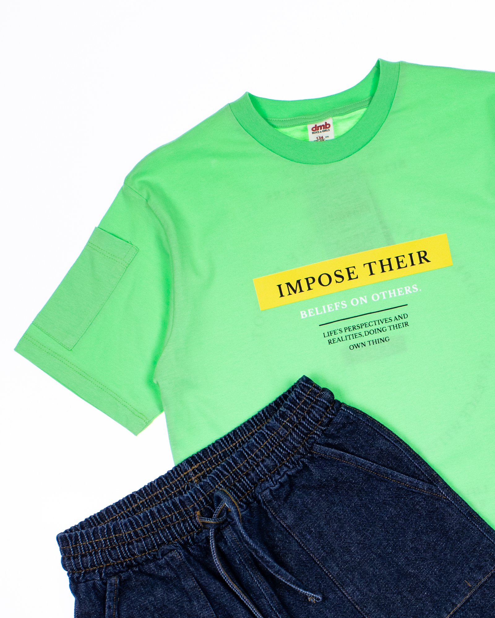 Летний костюм для мальчика Dmb оптом. Футболка прямого кроя с короткими рукавами и округлой горловиной. Бриджи из облегченной джинсы без эластана с боковыми карманами. Пояс на резинке с функциональным шнурком позволяет ругулировать объем на талии.
