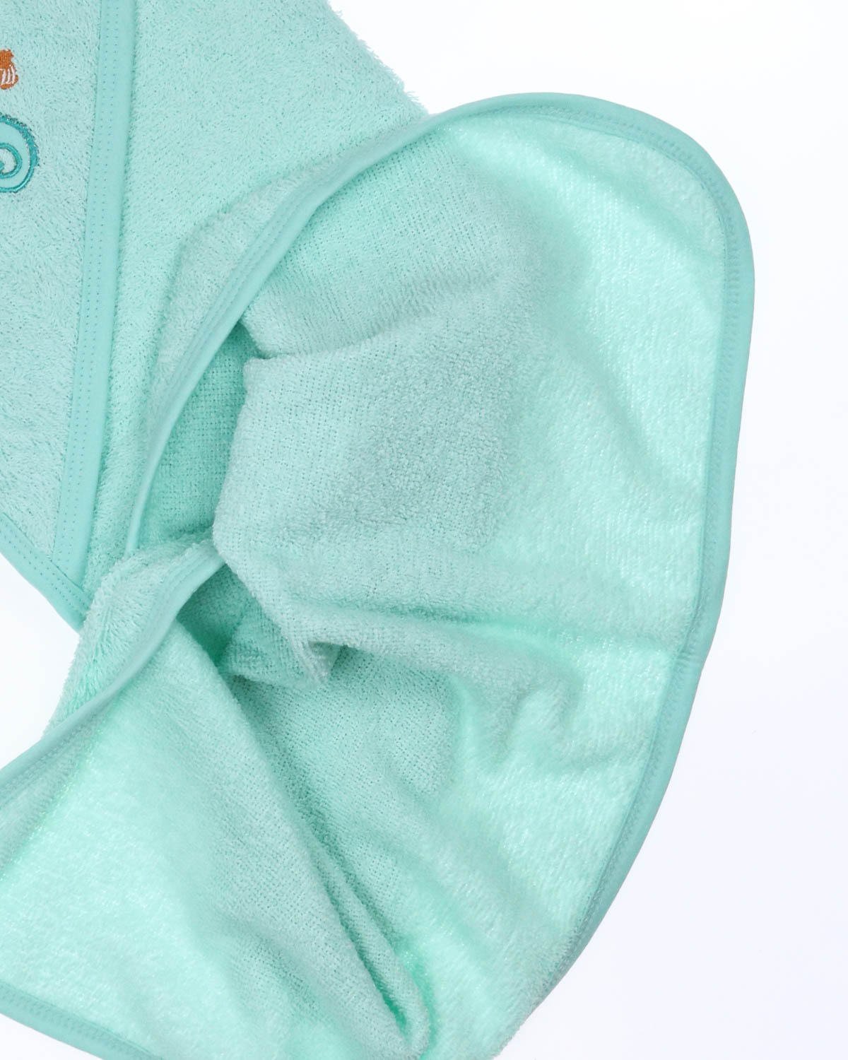 Полотенце с капюшоном,  позволяет вытирать ребенка после купания так, чтобы его головка всегда оставалась в тепле. Благодаря петельке -   детское полотенце с капюшоном легко повесить сушиться, а варежкой можно вытереть ребёнка после кормления, а также утром после крепкого сна.  Детское полотенце из махровой ткани приятное на ощупь, отлично впитывает влагу и быстро сохнет. Капюшон декорирован милейшей аппликацией и вышивкой. Края детского полотенца обработаны хлопковой трикотажной окантовкой.